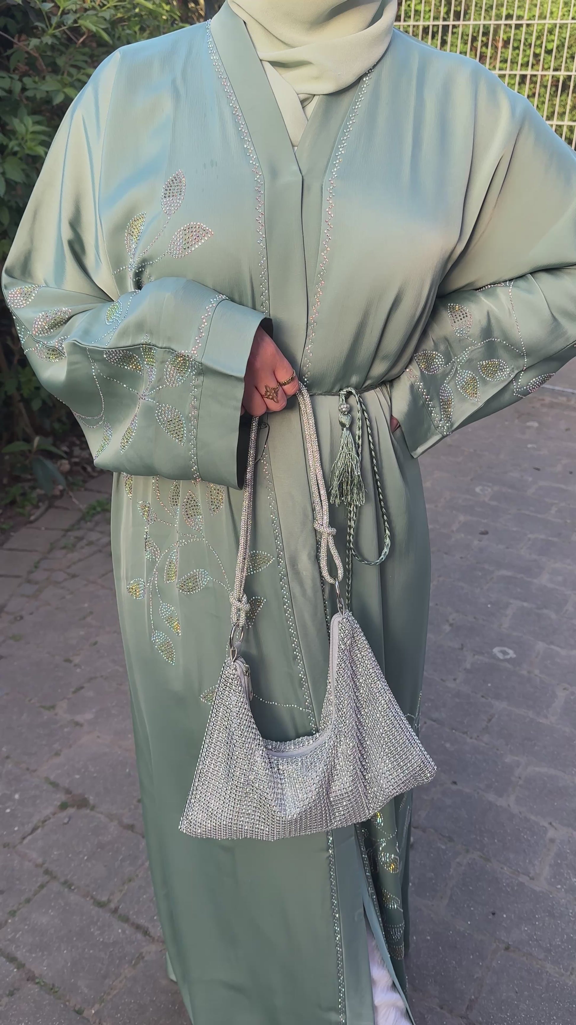 Frische trifft auf feinen Glanz: Diese Abaya in zartem Mintton strahlt Leichtigkeit und Eleganz aus. Zarte, handverzierte Steine fangen das Licht ein und verleihen der Abaya einen dezenten Sparkle-Effekt – edel, aber nie aufdringlich. Der fließende Schnitt sorgt für einen sanften Fall des Stoffes und unterstreicht deine Präsenz mit jedem Schritt. Perfekt für besondere Anlässe oder als stilvolles Statement im Alltag – feminin, zurückhaltend und doch ausdrucksstark.